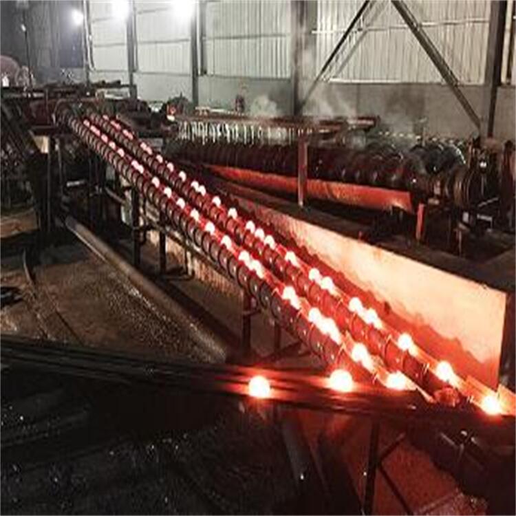 棒料加熱軋制生產線特點:1、棒料加熱軋制生產線生產效率高,以加工60的鋼球為例,每分鐘可生產70-80個鋼球。每小時可生產7噸,每班產量可達到50噸 ,是空氣錘鍛打鋼球的20倍。2、棒料加熱軋制生產線產品質量好,用熱軋加熱爐軋制的鋼球外型尺寸大、小均勻一致;溫度一樣,無過燒或燒不透的情況,因此熱處理后硬度均勻一致,外表硬度與內心硬度相差較小,產品質量好、質量穩定,合格率高達98%以上。 3、棒料加熱軋制生產線工人勞動強度較鍛打鋼球明顯降低,勞動環境得到明顯改善。使用熱軋加熱爐加熱,已經完全消除煙、氣污染的現象。4、棒料加熱軋制生產線生產鋼球操作簡單、自動化程度高,生產工序少。圓鋼不需要剪斷既可進爐加熱。不需要某些方面的專業勞動技能。新工人經過簡單培訓即可上崗生產,工人們再也不用為產品質量不合格操心,無限的調動了一線工人的勞動積極性。